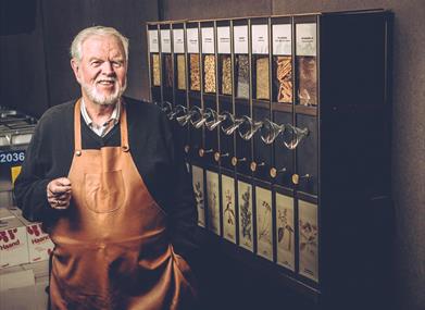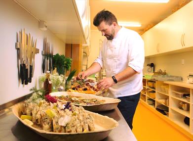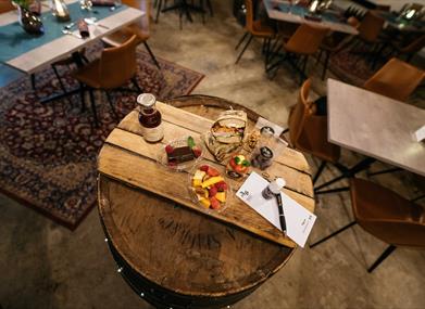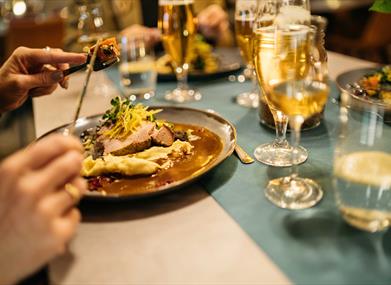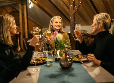 Im eigenen Restaurant der Brennerei gibt es leckere Speisen und genüssliche Getränke, bei denen sich die Kräuter für den Aquavit wie ein roter Faden durch die Mahlzeiten ziehen. Die Köche verwenden Zutaten aus der Region und die Zubereitung erfolgt mit Liebe zur norwegischen Esskultur. Drinnen haben 60 und draußen 120 Gäste Platz und das Lokal ist ganzjährig geöffnet.