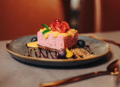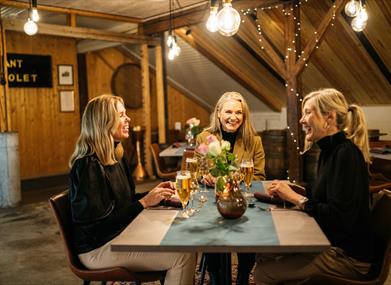 Im eigenen Restaurant der Brennerei gibt es leckere Speisen und genüssliche Getränke, bei denen sich die Kräuter für den Aquavit wie ein roter Faden durch die Mahlzeiten ziehen. Die Köche verwenden Zutaten aus der Region und die Zubereitung erfolgt mit Liebe zur norwegischen Esskultur. Drinnen haben 60 und draußen 120 Gäste Platz und das Lokal ist ganzjährig geöffnet.